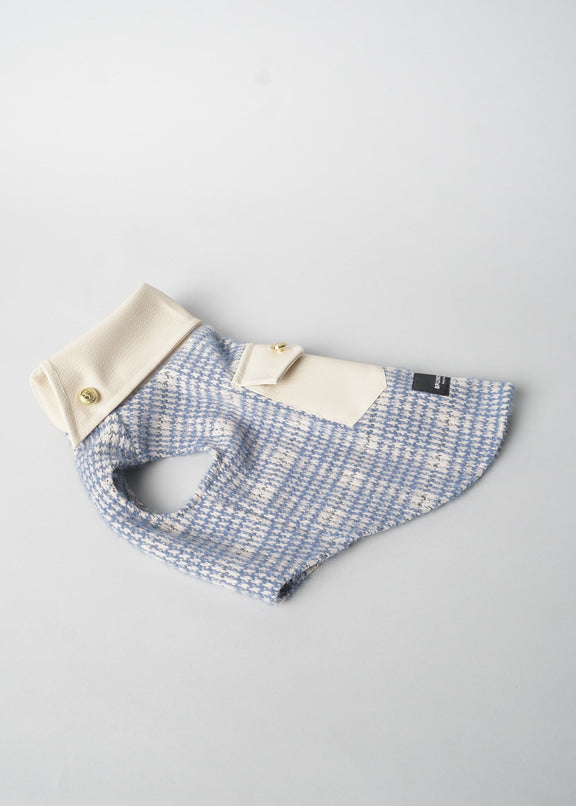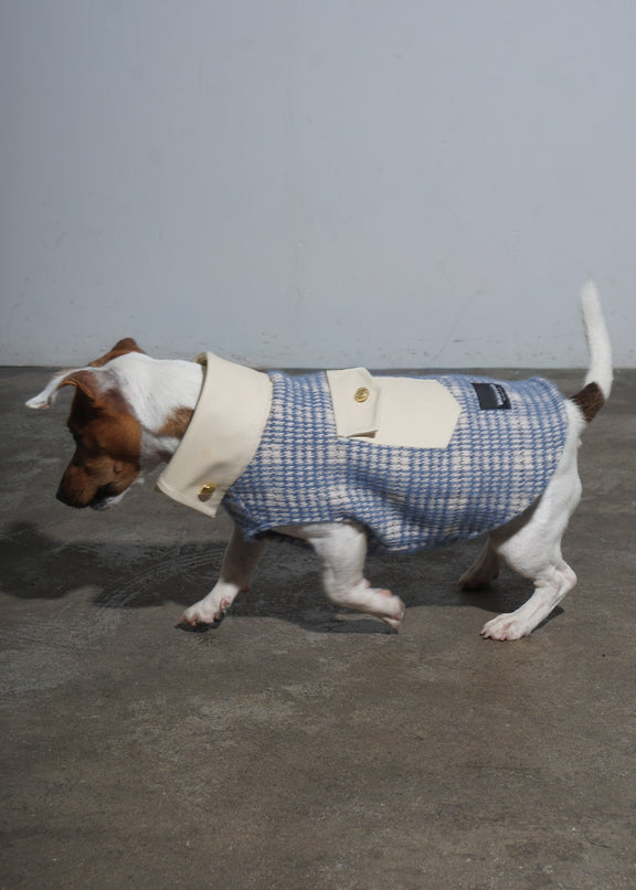A contrasting faux leather collar and pocket flap, finished with gold-tone buttons, bring tailoring details usually reserved for human fashion into the canine wardrobe. The bouclé wool keeps your dog warm on cold days while remaining breathable enough for everyday wear.
